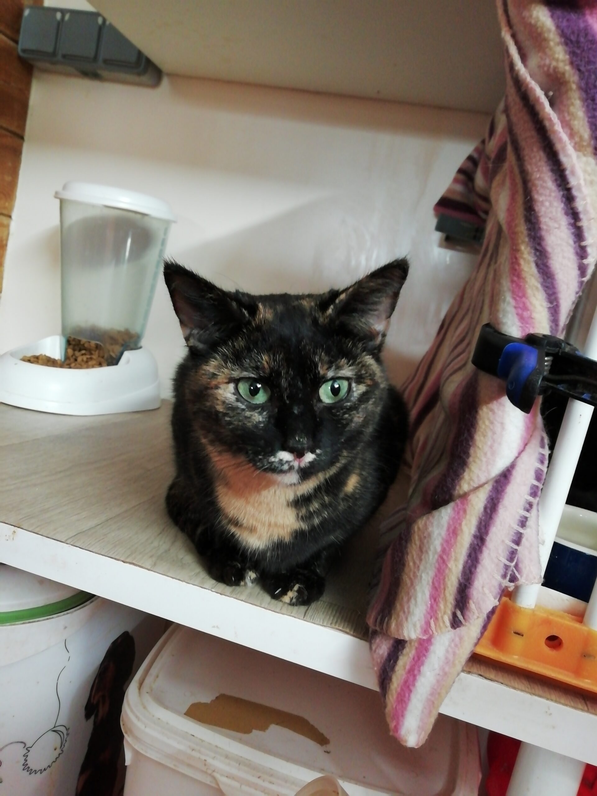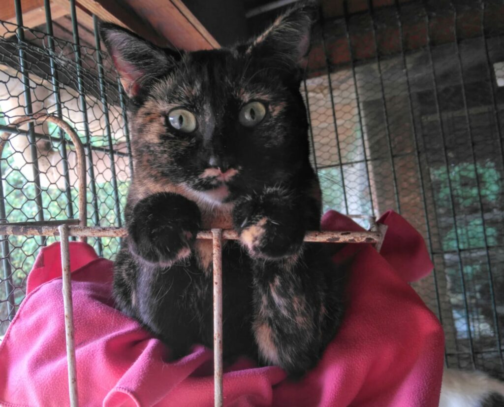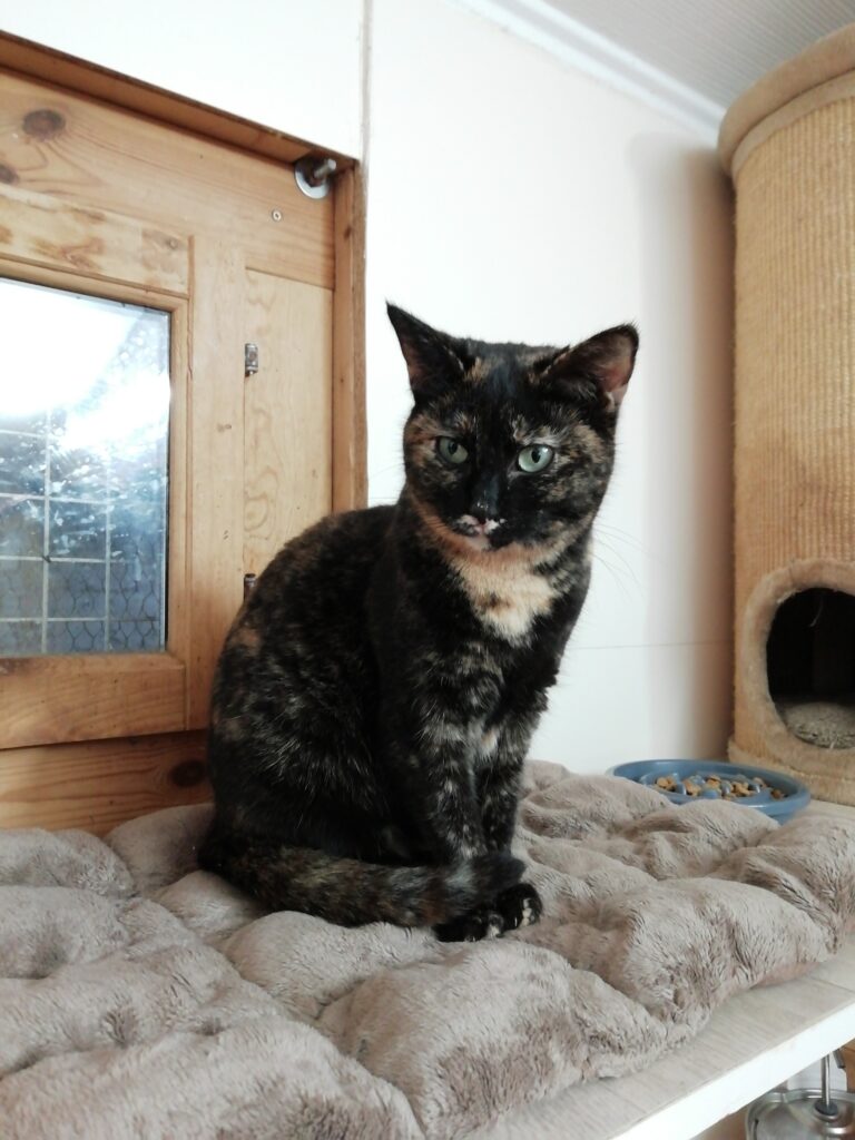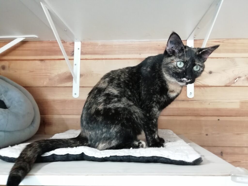 Cette minette a cependant fait beaucoup de progrès depuis plusieurs mois et accepte maintenant le contact avec nous et ne refuse pas quelques caresses à l’heure de la pâtée.